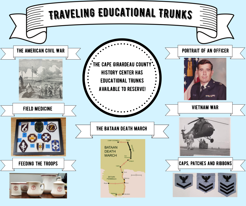 The Cape Girardeau Historical Society has educational history trunks available for reservation, these trunks are perfect for classrooms, organizations, homeschool groups or temporary exhibits.